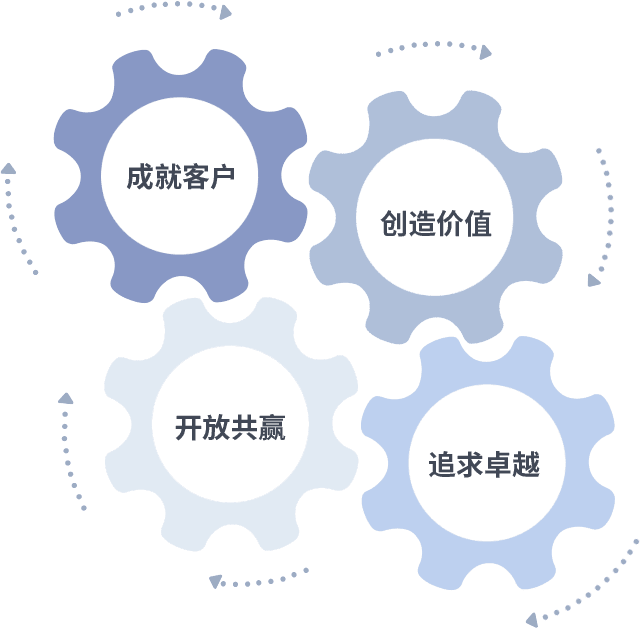 成就客户是一切决策的出发点,,创造价值是衡量所有工作的标准,,,追求卓越是我们做事做人的态度,,,开放共赢是我们的格局也是最终的结果。。价值观的齿轮环环相扣,,推动着组织里的每个人不断向前。。